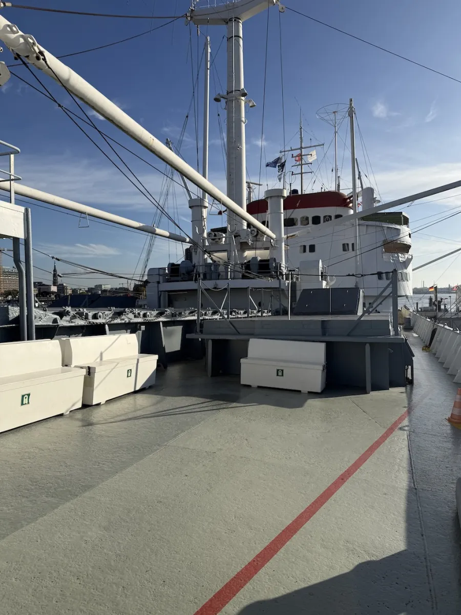 Der Rundgang ist klar strukturiert: Eine rote Linie auf dem Boden sowie zahlreiche Wegweiser führen Besucher Schritt für Schritt durch alle wichtigen Bereiche des Schiffs. Nach der ersten Station auf dem Hauptdeck geht es auf der rechten Seite über eine Treppe weiter in die oberen Bereiche. Bei Fragen stehen Matrosen und ehrenamtliche Helfer – gut erkennbar an ihren roten Overalls – zur Verfügung.