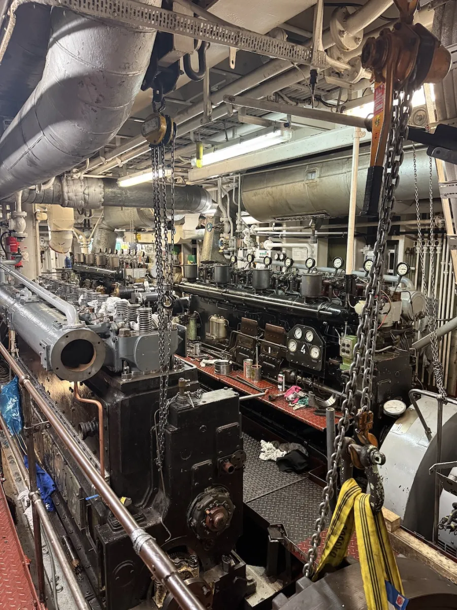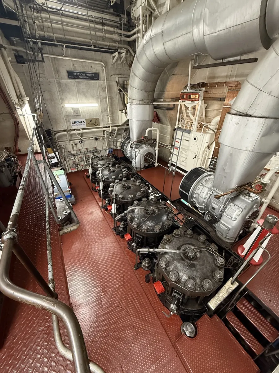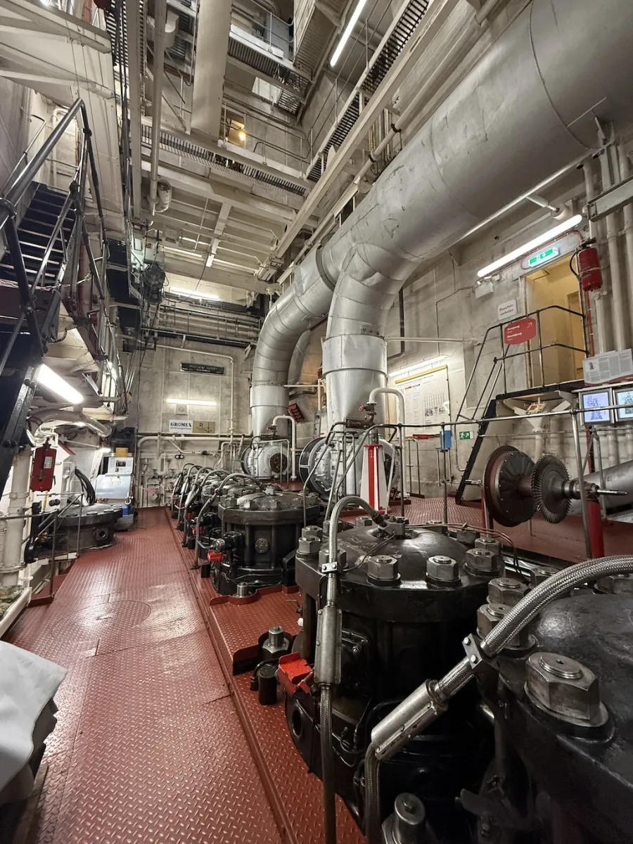 Arbeiten an Bord: Da auf dem Schiff laufend Instandhaltungsarbeiten stattfinden, sollte man Baustellen respektieren. Im Maschinenraum ist zudem darauf zu achten, nicht mit öligen Oberflächen in Kontakt zu kommen.