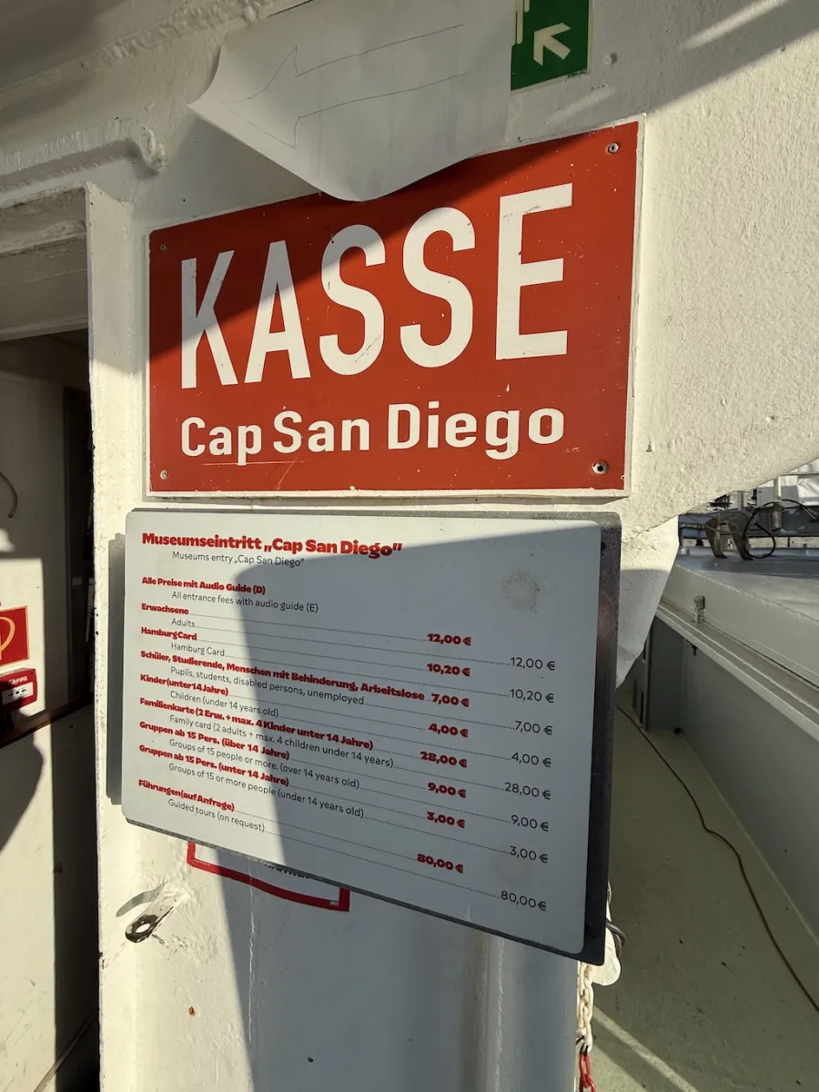 Die Cap San Diego im Hamburger Hafen bietet für Besucher aller Altersgruppen faire und transparente Eintrittspreise. Erwachsene zahlen regulär 12 €, erhalten jedoch mit der Hamburg Card oder Budni Card einen ermäßigten Preis von 10,20 €. Kinder unter 14 Jahren zahlen nur 4 €, während Schüler, Studenten, Menschen mit Behinderung sowie Arbeitslose gegen Vorlage eines Ausweises für 7 € an Bord dürfen.