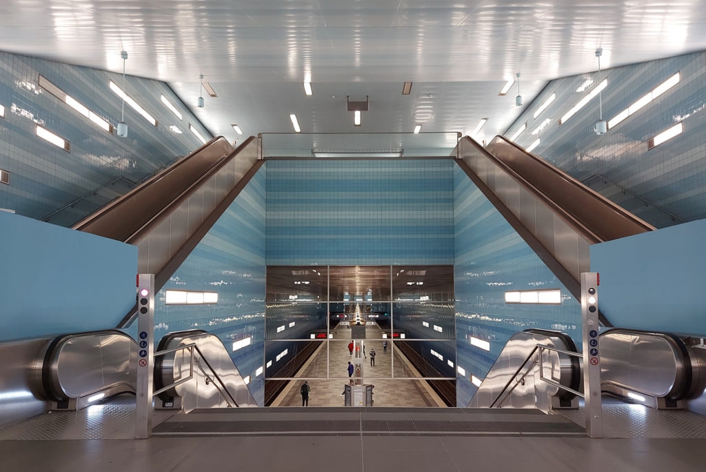 Maritimes Flair bringt die U-Bahn-Haltestelle „Überseequartier“ mit: Wenn du die Station betrittst, wirst du nicht nur von den schönen Blautönen überwältigt sein. Spitz die Ohren, denn es bahnen sich ein sanftes Meeresrauschen und Möwenlaute den Weg in deine Ohren. Achte auf die Farben, denn umso weiter du nach unten zur U-Bahn gehst, desto dunkler wird das Blau.
