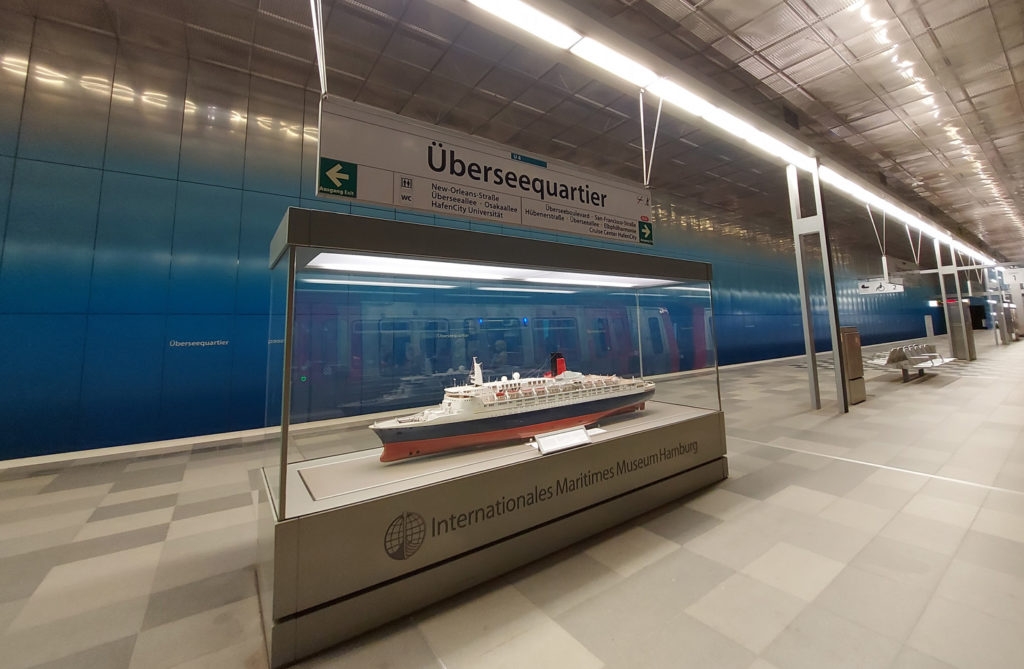 Wirf auch einen Blick auf den Schaukasten auf dem Bahnsteig. Es handelt sich dabei um eine Dauerleihgabe eines Modellschiffs der Queen Elizabeth 2. Dieses Modell stammt aus dem Internationalen Maritimen Museum Hamburg.
