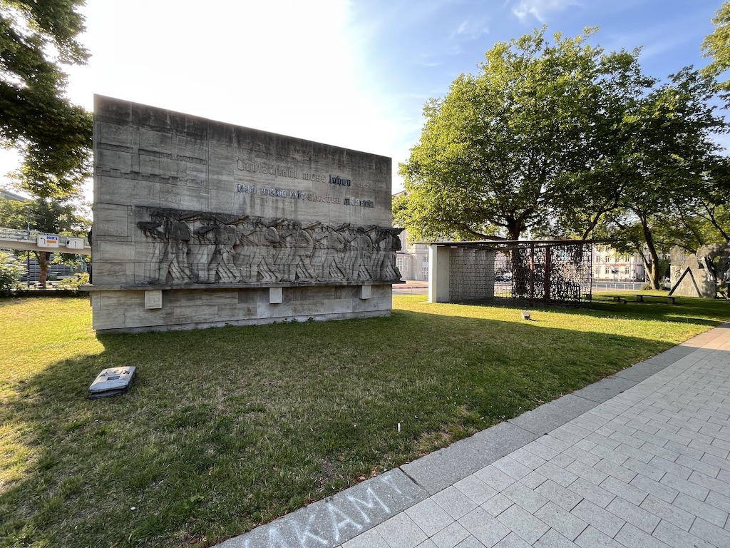 Seit 1934 findest du dort ein sieben Meter hohes Kriegerdenkmal aus Muschelkalk, welches viele Blicke auf sich zieht. Der große „Block“ zeigt 88 in Stein gehauene bewaffnete und lebensgroßen Soldaten, die einmal rundherum marschieren. Über ihren Köpfen steht in steiniger Schrift: „Deutschland muss leben – und wenn wir sterben müssen„. Im Gegensatz zum heutige Eindruck wurde das Kriegerdenkmal am Dammtordamm nicht als Erinnerung der Toten gebaut, sondern während der Vorbereitung auf einen Krieg.